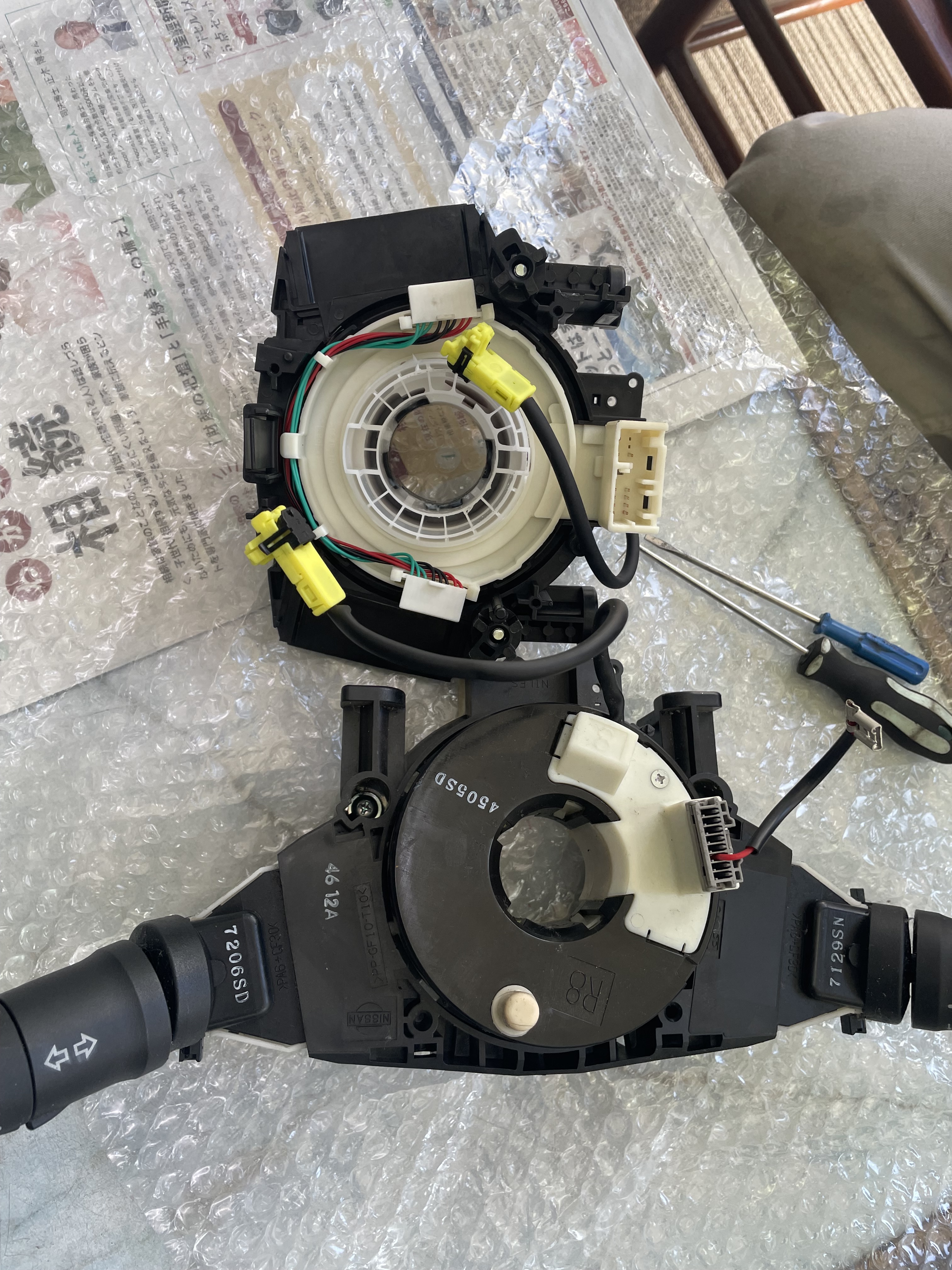 スパイラルケーブルを導通確認をしたところ、断線していましたので交換します。